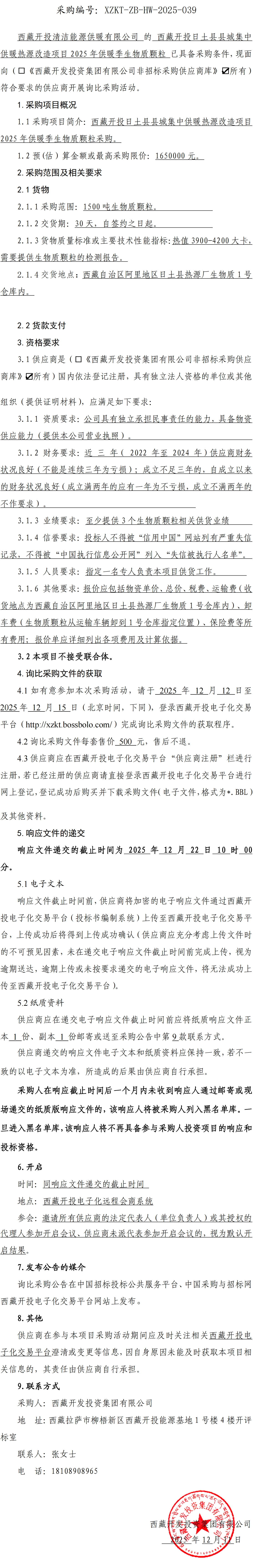 西藏開投日土縣縣城集中供暖熱源改造項目2025年供暖季生物質(zhì)顆粒詢比采購公告