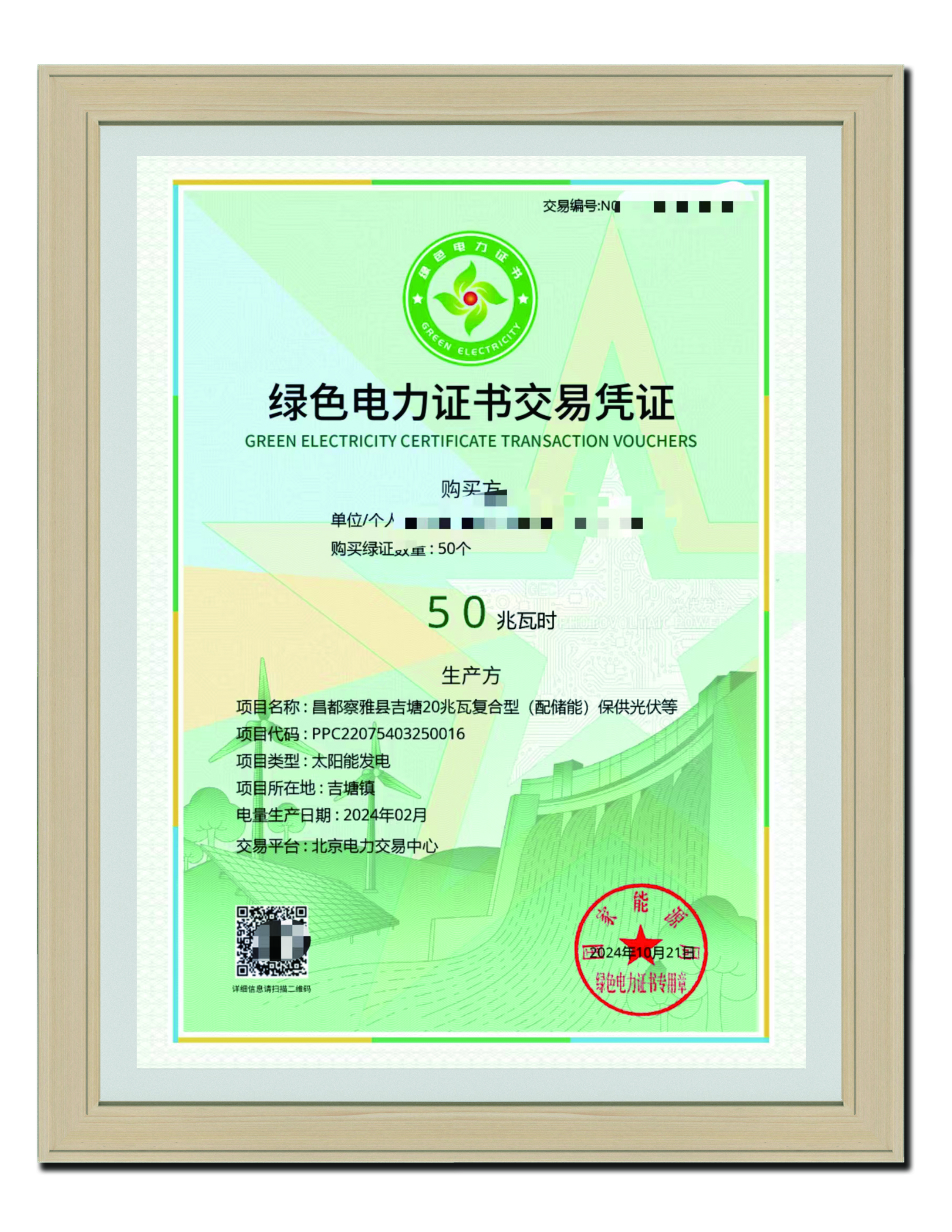 2024年10月21日綠色電力證書交易憑證50兆瓦時(shí)