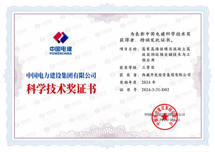 日前,中國(guó)電建集團(tuán)公布了2024年度中國(guó)電建科學(xué)技術(shù)獎(jiǎng)獲獎(jiǎng)項(xiàng)目名單,西藏開投集團(tuán)果多水電站創(chuàng)新成果——“高寒高海拔碾壓混凝土高效筑壩關(guān)鍵技術(shù)與工程應(yīng)用”榮獲中國(guó)電建科學(xué)技術(shù)獎(jiǎng)三等獎(jiǎng)。