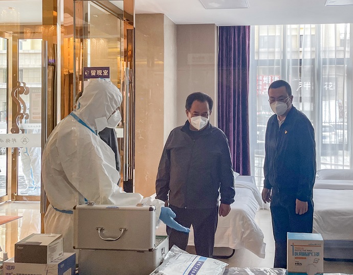 多吉次珠一行詳細(xì)察看了西藏開投邦錦花園酒店出入登記點、留觀室、疫情防控物資儲備室、全日制餐廳等區(qū)域,聽取了酒店疫情防控工作匯報。聽取匯報后,多吉次珠對酒店全力做好一線抗疫醫(yī)務(wù)工作者和公安民警后勤保障工作給予高度評價。他指出,西藏開投邦錦花園酒店站位高、有擔(dān)當(dāng),主動承擔(dān)抗疫一線干部職工保障工作重要任務(wù),充分彰顯了國企擔(dān)當(dāng)、國企速度、國企精神,有力發(fā)揮了國資國企的“頂梁柱”作用。