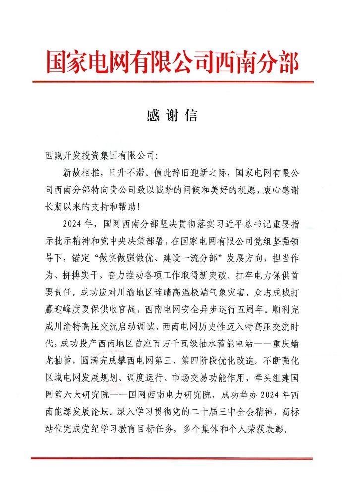 新年伊始,西藏開投集團(tuán)收到來自國網(wǎng)電力有限公司西南分部的一封感謝信,對集團(tuán)積極推動西藏電源建設(shè),提前謀劃西藏昌都地區(qū)能源資源整體開發(fā),推動昌都負(fù)荷中心抽蓄建設(shè),以及支持西南能源發(fā)展論壇舉辦,推動區(qū)域電網(wǎng)目標(biāo)網(wǎng)架建設(shè),促進(jìn)區(qū)域電力發(fā)展凝聚共識作出的貢獻(xiàn)表示感謝。