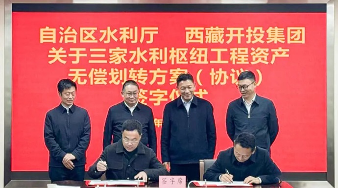 12月11日,自治區(qū)水利廳與西藏開投集團(tuán)在拉薩簽署旁多、滿拉、拉洛三大水利樞紐工程資產(chǎn)無償劃轉(zhuǎn)協(xié)議,標(biāo)志著西藏國有企業(yè)改革邁出堅實步伐。自治區(qū)水利廳黨組副書記、廳長和忠華,區(qū)政府國資委黨委委員、副主任于雷,西藏開投集團(tuán)黨委書記、董事長祁騰武出席簽字儀式并講話。自治區(qū)水利廳黨組成員、副廳長趙輝與西藏開投集團(tuán)黨委委員、副總經(jīng)理尼瑪代表雙方簽署協(xié)議。集團(tuán)領(lǐng)導(dǎo)羅布次仁、陳焱罡出席儀式。