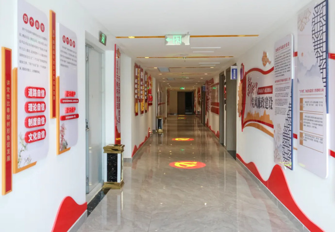 集團黨建活動陣地位于集團辦公樓11樓,占地180㎡,分為黨建文化長廊、黨員活動室、支部會議室三個功能區(qū),集黨員學習教育、組織生活開展、黨建成果展示等功能于一體。其中,黨建文化長廊由黨建引領(lǐng)發(fā)展、傳承紅色精神、筑牢戰(zhàn)斗堡壘、挺膺擔當奮進、構(gòu)建精神文明、建設(shè)廉政文化六個部分組成,圖文并茂的形式讓每一位走過長廊的黨員都能深刻領(lǐng)悟黨建工作的深刻內(nèi)涵。黨員活動室包含了組織架構(gòu)展示、榮譽展示、黨建工作展示、學習區(qū)等內(nèi)容,配備桌椅茶幾等休閑設(shè)施,布置溫馨,氛圍濃厚。