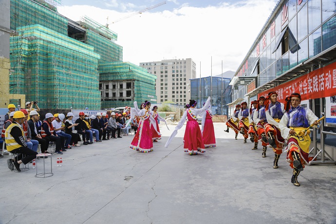 在能源基地項(xiàng)目現(xiàn)場(chǎng),青春洋溢的大學(xué)生隊(duì)員們以特色舞蹈展現(xiàn)了西藏地方文化。西藏大學(xué)帶隊(duì)老師向工人代表贈(zèng)送了應(yīng)急處置知識(shí)包,并向參建工人普及日常應(yīng)急知識(shí)。隨后,師生們?cè)诩瘓F(tuán)公司安全監(jiān)管人員的帶領(lǐng)下,參觀了能源基地項(xiàng)目。