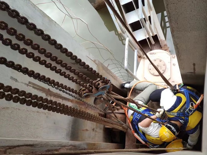 9月5日11時(shí)30分,果多水電站上游來水量突增,水庫攔污漂變浮箱無法及時(shí)上浮,導(dǎo)致大量垃圾飄進(jìn)進(jìn)水口區(qū)域,給機(jī)組運(yùn)行造成一定的安全隱患。吉克爾博接到部門安排后,馬上帶領(lǐng)兩名青年員工到浮箱上利用千斤頂、手動葫蘆等工具開展處理。經(jīng)過分析、討論,判定攔污漂卡澀的原因?yàn)閷?dǎo)向輪長期受力不均發(fā)生變形,利用千斤頂反向作用力和手拉葫蘆的牽引力,最終將攔污漂卡澀問題解決。