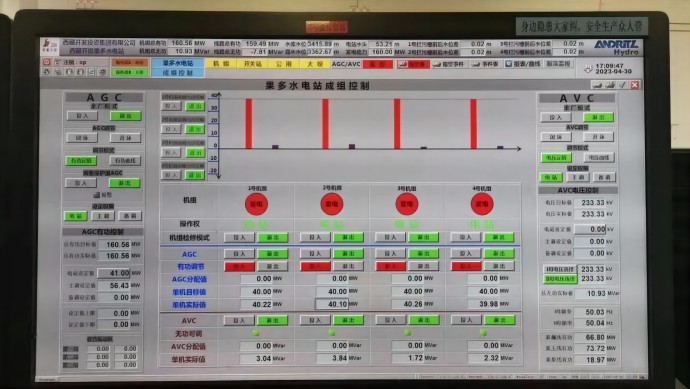 4月30日晚高峰期間,果多水電站4臺機組滿負荷160MW運行,各項工況指標良好。