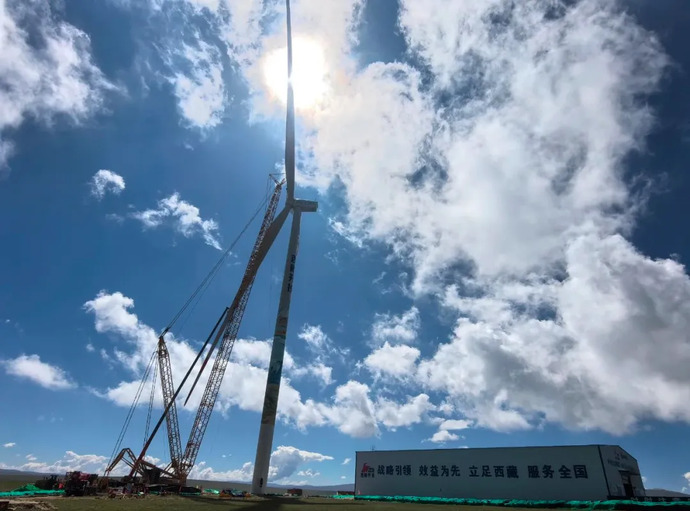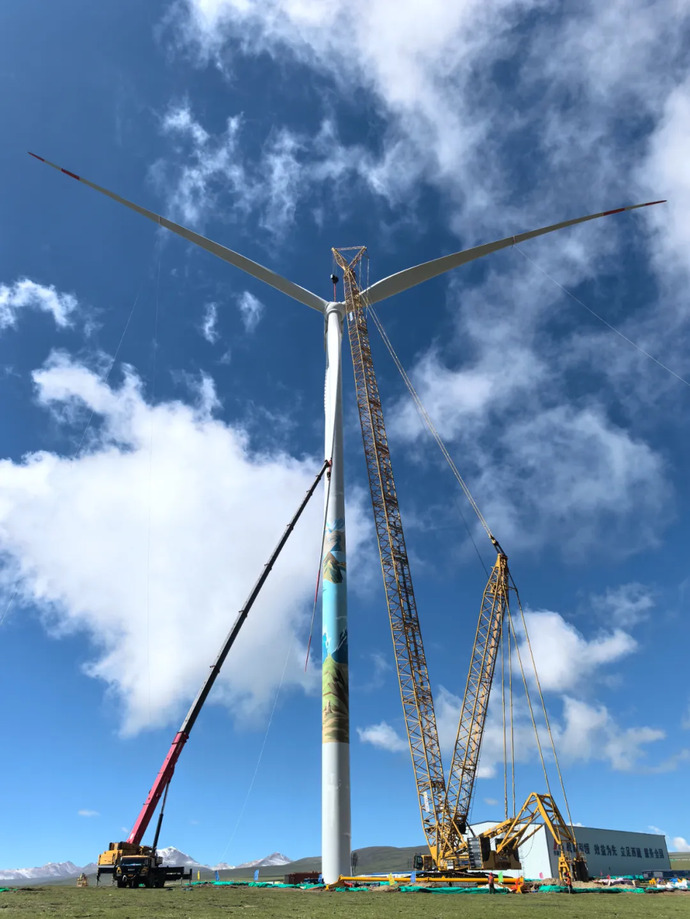 7月5日,海拔4700m的藏北高原,在一臺800T履帶式起重機與兩臺100T汽車起重機輔助下,西藏開投色尼區(qū)曲果嘎姆200MW風(fēng)電項目13#風(fēng)機風(fēng)力發(fā)電機組葉片與輪轂緩緩升起,于10:45順利與機艙完成對接,標(biāo)志著該項目首臺風(fēng)機順利完成吊裝。
