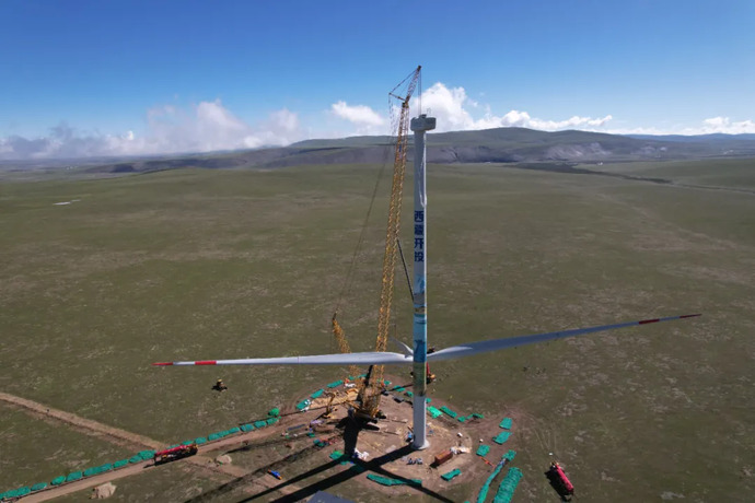 面對超高海拔、極低空氣密度、嚴(yán)寒缺氧、生態(tài)脆弱等困難挑戰(zhàn),項目團隊優(yōu)化了風(fēng)機葉片氣動外形與材料抗低溫性能,首次實現(xiàn)單機5MW級風(fēng)機在4900米海拔的模塊化集成設(shè)計。同時,通過生物酶催化軟基固結(jié)試驗,篩選耐低溫酶系,構(gòu)建“酶-土-溫度”動態(tài)反應(yīng)模型,即優(yōu)化了沼澤區(qū)道路固化參數(shù),也最大限度減少對生態(tài)脆弱地區(qū)的草甸破壞及生態(tài)擾動。