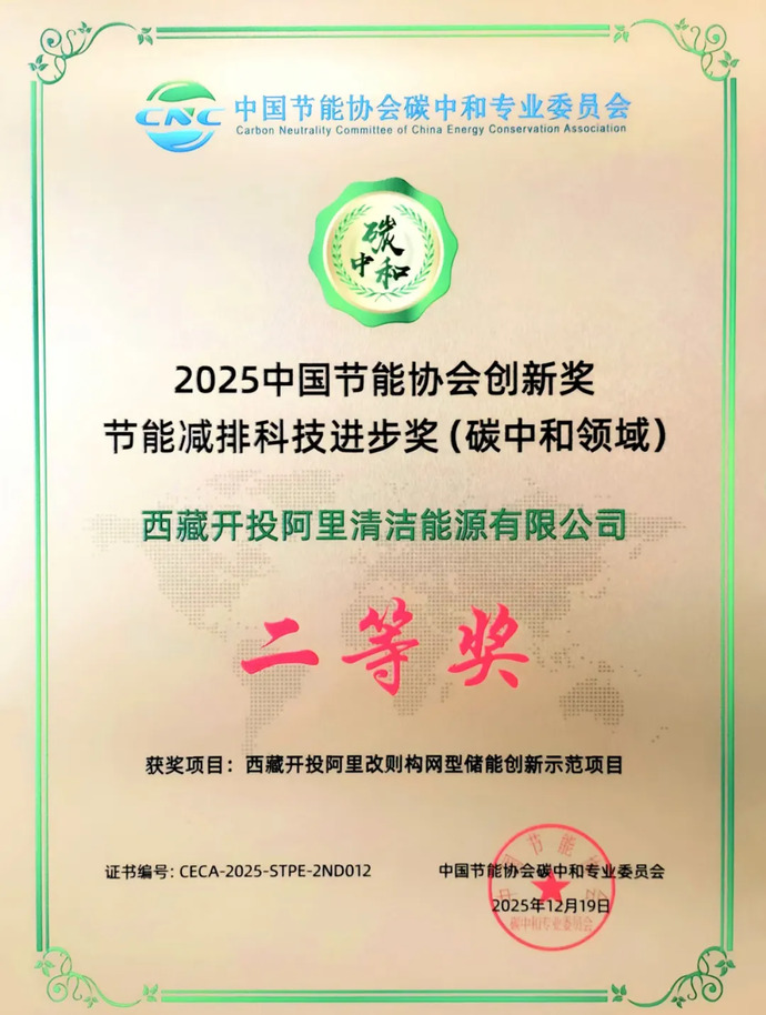 近日,由中國質(zhì)量認(rèn)證中心、中國節(jié)能協(xié)會碳中和專業(yè)委員會聯(lián)合頒發(fā)的2025中國節(jié)能協(xié)會創(chuàng)新獎名單揭曉,由西藏開投阿里清潔能源公司投資建設(shè)的阿里改則構(gòu)網(wǎng)型儲能創(chuàng)新示范項(xiàng)目獲“節(jié)能減排科技進(jìn)步獎(碳中和領(lǐng)域)二等獎”。