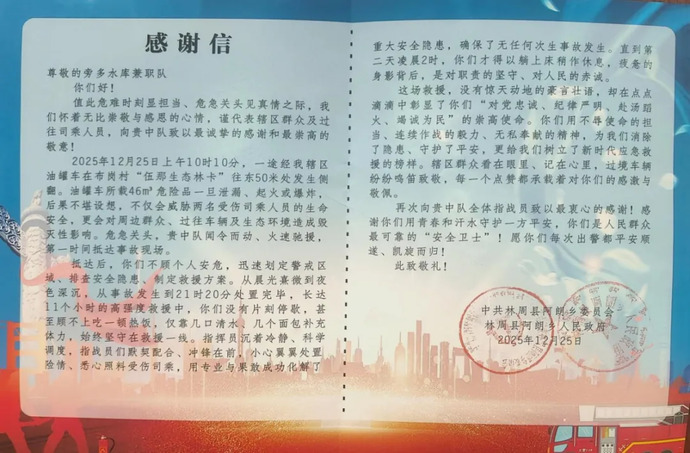 近日,西藏開投旁多水電公司兼職消防隊獲林周縣阿朗鄉(xiāng)黨委、政府授予的錦旗與感謝信,表彰其在一起?;愤\輸車輛側翻事故救援中的突出貢獻。