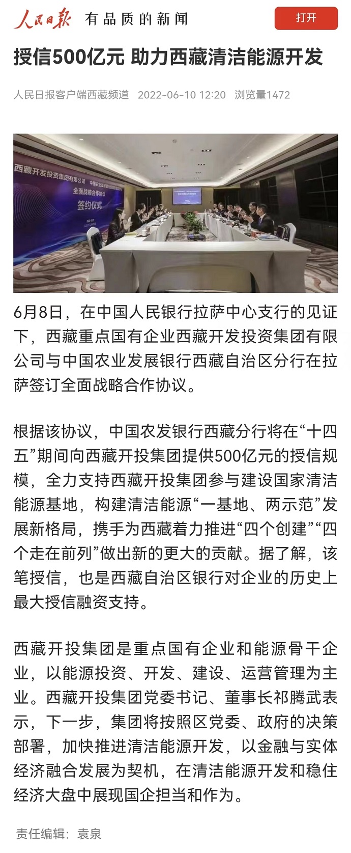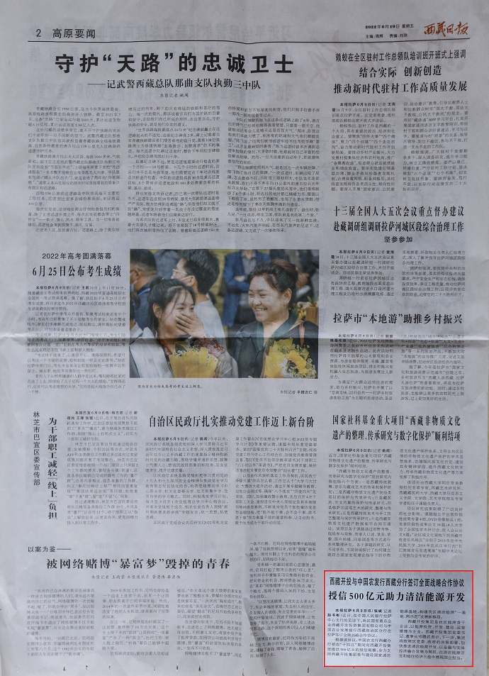 (編者按)6月10日,《人民日報(bào)》客戶端西藏頻道報(bào)道了《授信500億元 助力西藏清潔能源開發(fā)》?!段鞑厝請?bào)》2022年6月10日在第2版“高原要聞”欄目刊登文章,報(bào)道《授信500億元|西藏開投集團(tuán)與中國農(nóng)發(fā)行西藏分行簽訂全面戰(zhàn)略合作協(xié)議》。西藏電視臺2022年6月10日在西藏電視臺影視文化頻道《今晚九點(diǎn)》欄目報(bào)道了《授信500億元|西藏開投集團(tuán)與中國農(nóng)發(fā)行西藏分行簽訂全面戰(zhàn)略合作協(xié)議》,《珠峰云》平臺同步播放。新華網(wǎng)、經(jīng)濟(jì)日報(bào)、西藏衛(wèi)視、西藏日報(bào)客戶端、網(wǎng)信西藏、今日頭條等媒體均報(bào)道了相關(guān)新聞。全文如下: