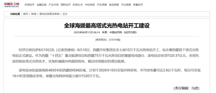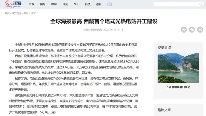 媒體報(bào)道丨全球海拔最高、西藏首個(gè)塔式光熱電站開(kāi)工建設(shè)