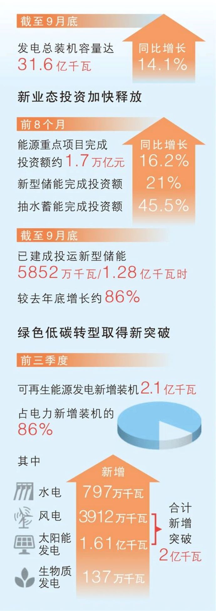 能源新業(yè)態(tài)投資多點開花。前8個月,新型儲能完成投資額同比增長21%,抽水蓄能完成投資額同比增長45.5%。甘肅、青海、新疆一批多能互補清潔能源基地項目有序推進(jìn),內(nèi)蒙古在建綠氫制備項目、河南在建加氫設(shè)施項目持續(xù)形成有效投資。