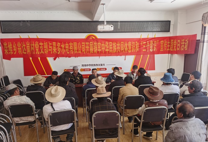 6月25日,果多水電公司黨支部結(jié)合習(xí)近平新時代中國特色社會主義思想主題教育活動與柴維鄉(xiāng)翁達(dá)崗村黨支部聯(lián)合開展了以“鑄牢中華民族共同體意識和‘三個意識’”為主題的黨日活動。