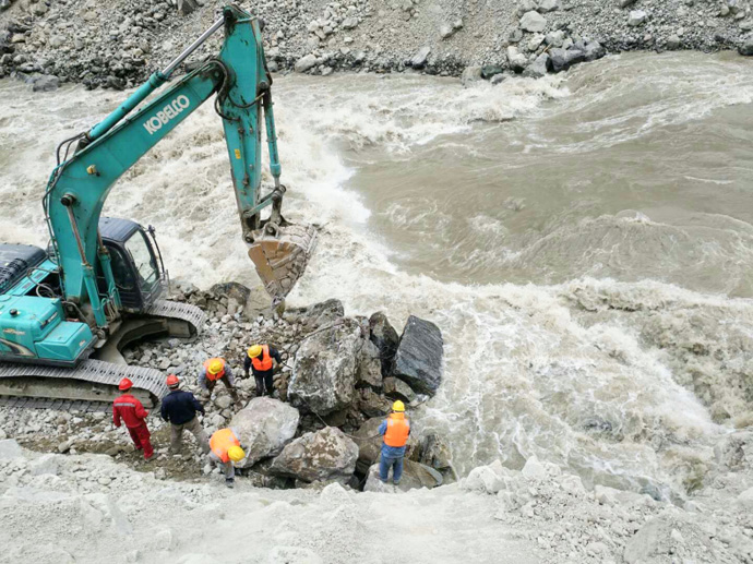 7月4日受持續(xù)強降雨影響,易貢藏布河水暴漲,7月5日凌晨5時,金橋水電站壩前水位達到3412.86米,施工區(qū)水流量達到647 m3/s。24小時后,壩前水位3412.03米,已建成的右岸壩段及在建的左岸壩段因為質(zhì)量把控到位、施工組織及防洪措施到位,經(jīng)受住了洪水的考驗;但是從嘉黎縣至金橋水電站施工現(xiàn)場的100公里公路有19處路段出現(xiàn)不同程度損毀,其中3處路段完全中斷,沖毀路段約5公里,路基、堡坎垮塌約2公里,金橋水電站主要建材物資暫時停運,尼屋鄉(xiāng)2000余村民出行受阻,存在極大安全隱患,嚴(yán)重影響了受災(zāi)群眾的生產(chǎn)生活。