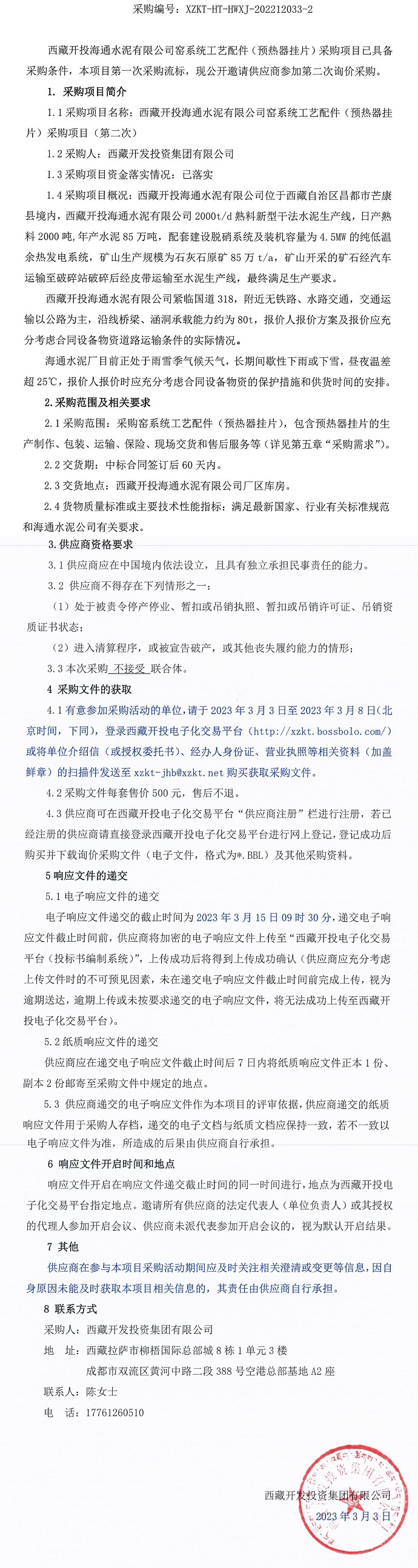 西藏開投海通水泥有限公司窯系統(tǒng)工藝配件(預熱器掛片)采購項目(第二次)詢價采購公告