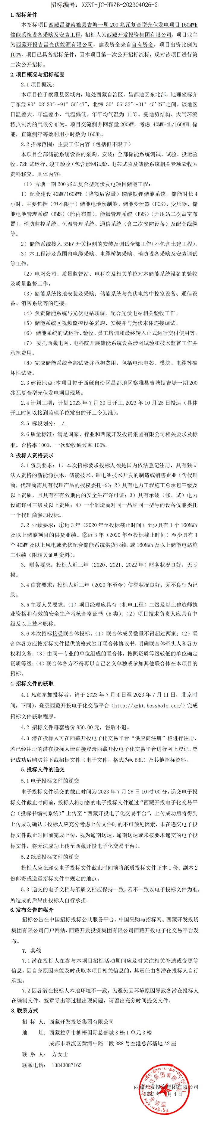 西藏昌都察雅縣吉塘一期200兆瓦復(fù)合型光伏發(fā)電項(xiàng)目160MWh儲(chǔ)能系統(tǒng)設(shè)備采購及安裝工程招標(biāo)公告(第二次)