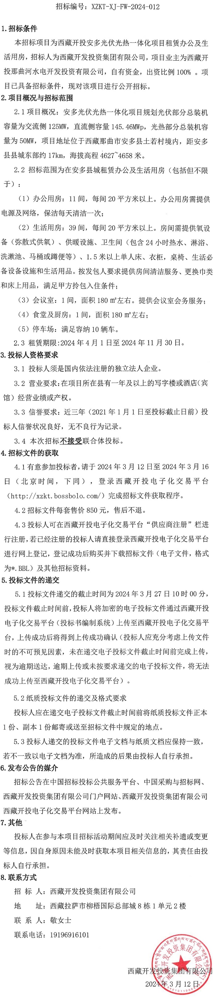 西藏開投安多光伏光熱一體化項目租賃辦公及生活用房招標公告