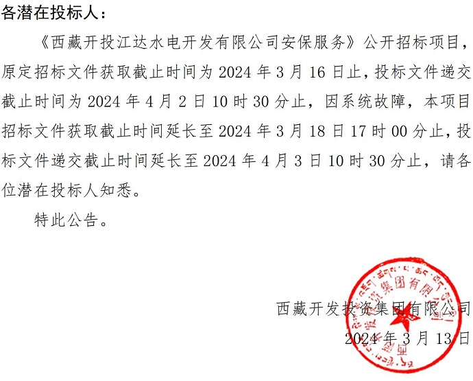 關(guān)于延長《西藏開投江達(dá)水電開發(fā)有限公司安保服務(wù)》招標(biāo)文件