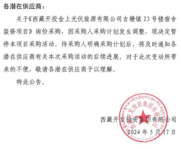 關(guān)于暫?!段鞑亻_投金上光伏能源有限公司吉唐鎮(zhèn)23號樓宿舍裝修項目》詢價采購活動的公告