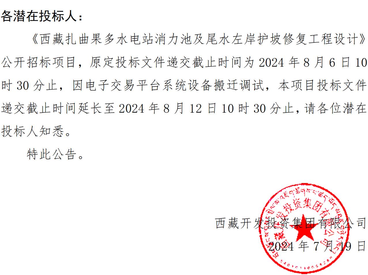關(guān)于延長《西藏扎曲果多水電站消力池及尾水左岸護(hù)坡修復(fù)工程設(shè)計(jì)》投標(biāo)文件遞交截止時間的公告