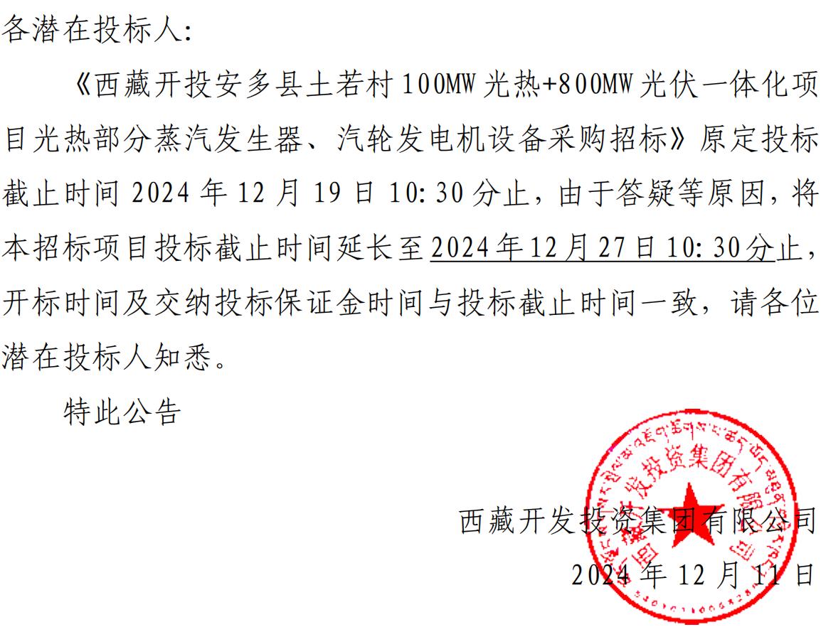 關于延長《西藏開投安多縣土碩 100MW 光熱+800MW 光伏一 體化項目光熱部分蒸汽發(fā)生器、汽輪發(fā)電機設備采購招標》投 標截止時間的公告